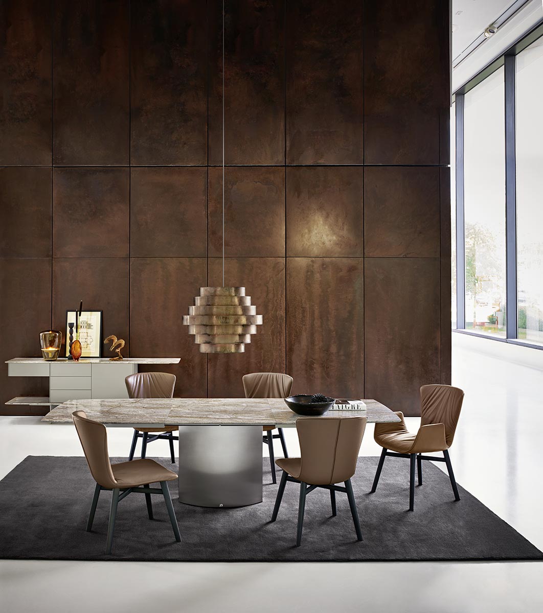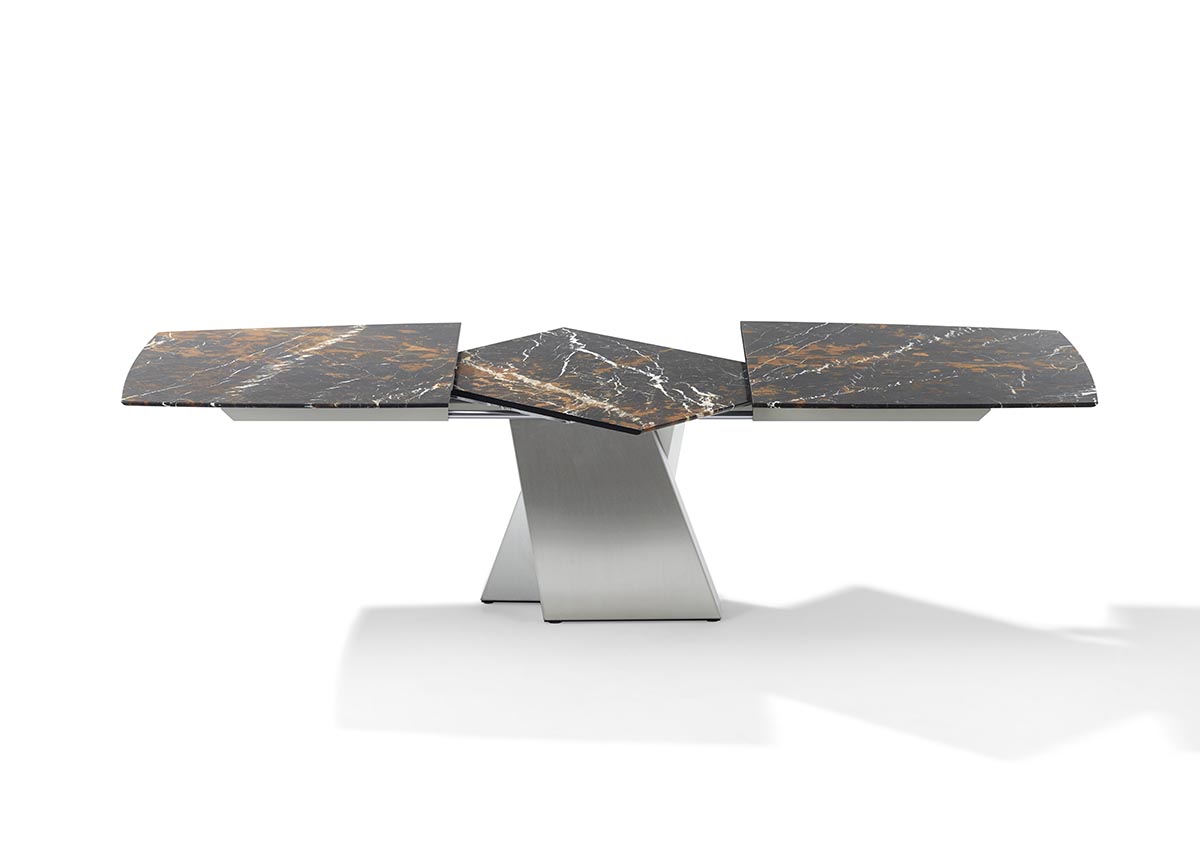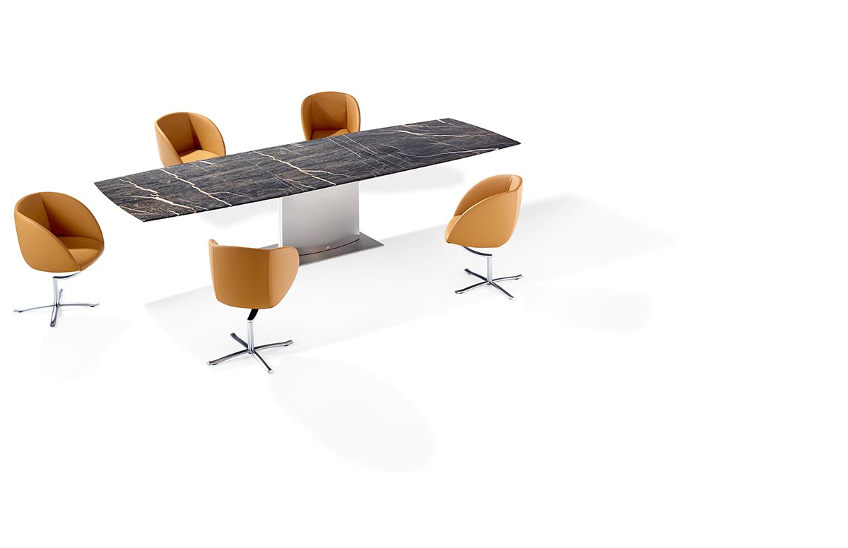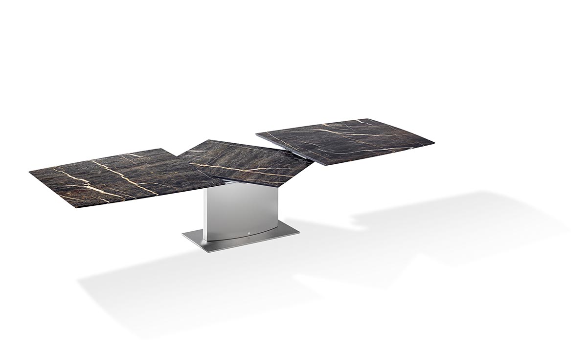 Der ADLER steht seit mehr als 20 Jahren für ein herausragendes Modell mit hohen essentiellen Werten. Nun hat er einen weiteren Unterbau bekommen. Der Zentralsockel in Kreuzform gibt dem Tisch eine dynamische Erscheinung. Dieser Edelstahlsockel kann auch in allen Farben passend lackiert werden. Durch die beiden entgegengesetzt gespiegelten Rechtecke, die sich zur Tischplatte hin verjüngen, scheint die Tischplatte zu schweben.
