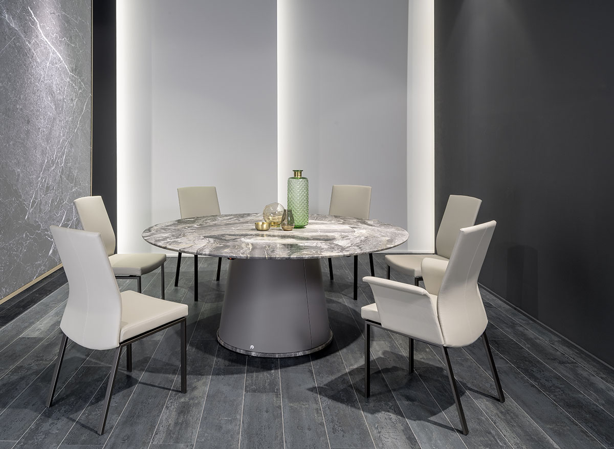 Linus ist mit einem Gestell aus Stahl in Hochglanz-Chrom oder Mattchromfarben und einem Bezug in Weißpolster, Leder I oder Leder II Elmosoft lieferbar.