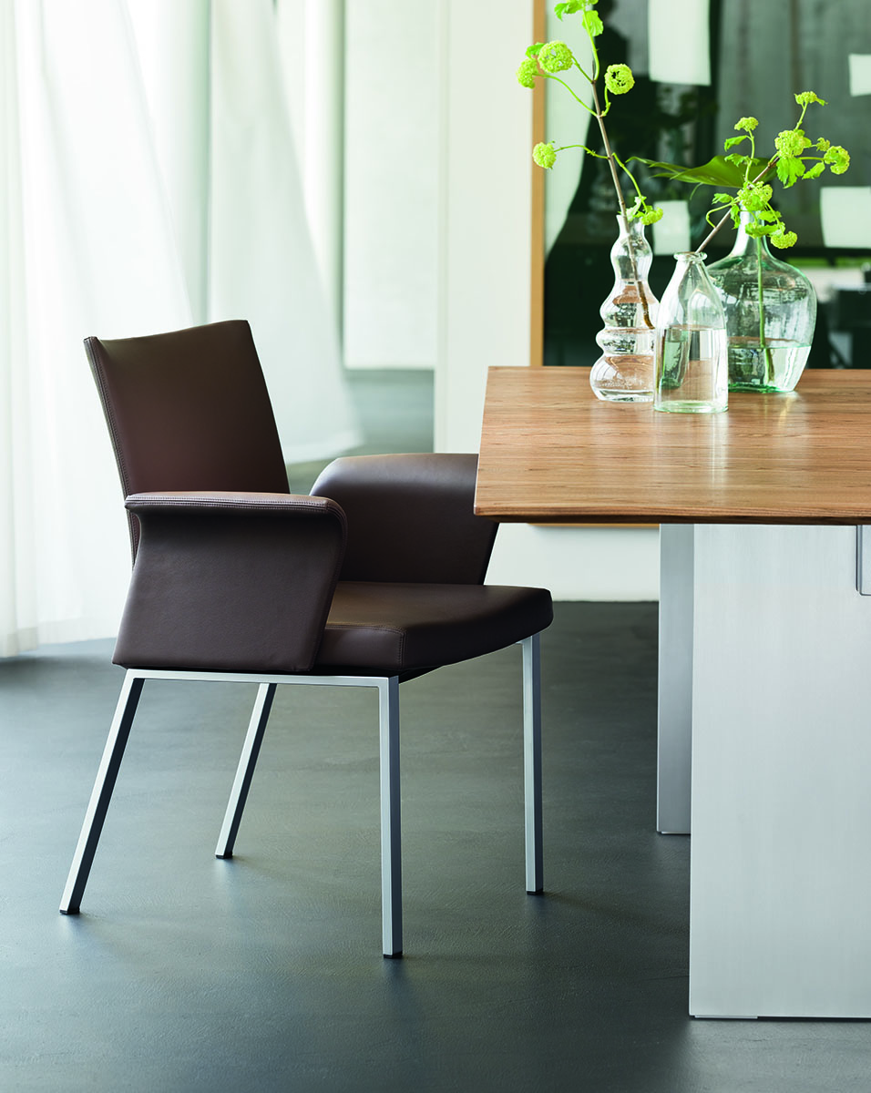Es stehen zwei Armlehnen zur Auswahl. Eine gepolsterte Armlehne aus rechteckigem Stahlrohr in Hochglanz-Chrom oder Mattchrom-farben oder eine voll gepolsterte Armlehne.