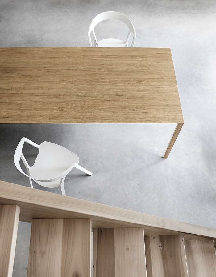Hauptmerkmal des Tischs Thin-k ist seine unglaublich dünne Platte: nur 6 mm. Die Herausforderung lag darin, einen großflächigen Tisch herzustellen und dabei trotz des Einsatzes einer unglaublich geringen Stärke eine makellose Widerstandsfähigkeit und Ebenheit beizubehalten. Das Ergebnis dieser von Kristalia durchgeführten Entwicklung ist die Präsentation eines bis zu 3 Meter langen und bis zu 120 cm breiten Tischs. Die Version aus Aluminium zeichnet sich durch einen ansprechenden monochromatischen und einstofflichen Effekt aus: Sowohl die Platte als auch die Beine sind nämlich in 4 möglichen Farbtönen in ein und derselben Pulverlackierung ausgeführt, wodurch jeder Farbunterschied vermieden und maximale UV-Beständigkeit garantiert wird. Die Tische Thin-K sind aber nicht nur für den Wohnbereich, sondern auch für Gemeinschaftseinrichtungen gedacht, da sie sich in Arbeitsplätze oder in Tische für Besprechungs- und Versammlungsräume verwandeln können. Die Platten aus Aluminium sind auch mit Echtholzfurnier in gebürsteter Ausführung erhältlich, eine Behandlung, die die natürliche Maserung des Holzes hervorhebt. Für eine farbliche Übereinstimmung besitzen die Beine die gleiche Ausführung. Als Alternative kann die Platte auch aus Glas mit glänzend oder matt lackierter Unterseite hergestellt werden.