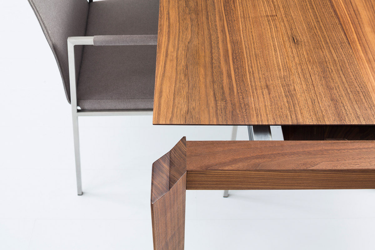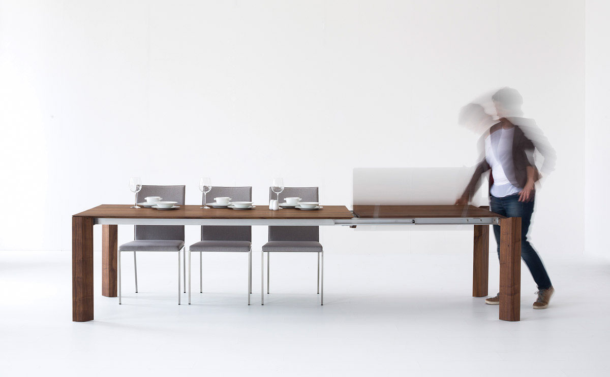 Wenn Leichtigkeit und Eleganz mit technisch perfekter Funktionalität auf einen Nenner gebracht werden, handelt es sich um die schlichte Schönheit des Esstisches SL IV. Durchgehende, angeschnittene Stollen bieten optimale Beinfreiheit. Die 22 mm dünne Platte wirkt, unterstützt von den Edelstahlzargen an den Längsseiten, fast schwebend. Im 1-Hand-Umdrehen lässt sich der Tisch auf eine Länge bis zu 3,30 m ausziehen.