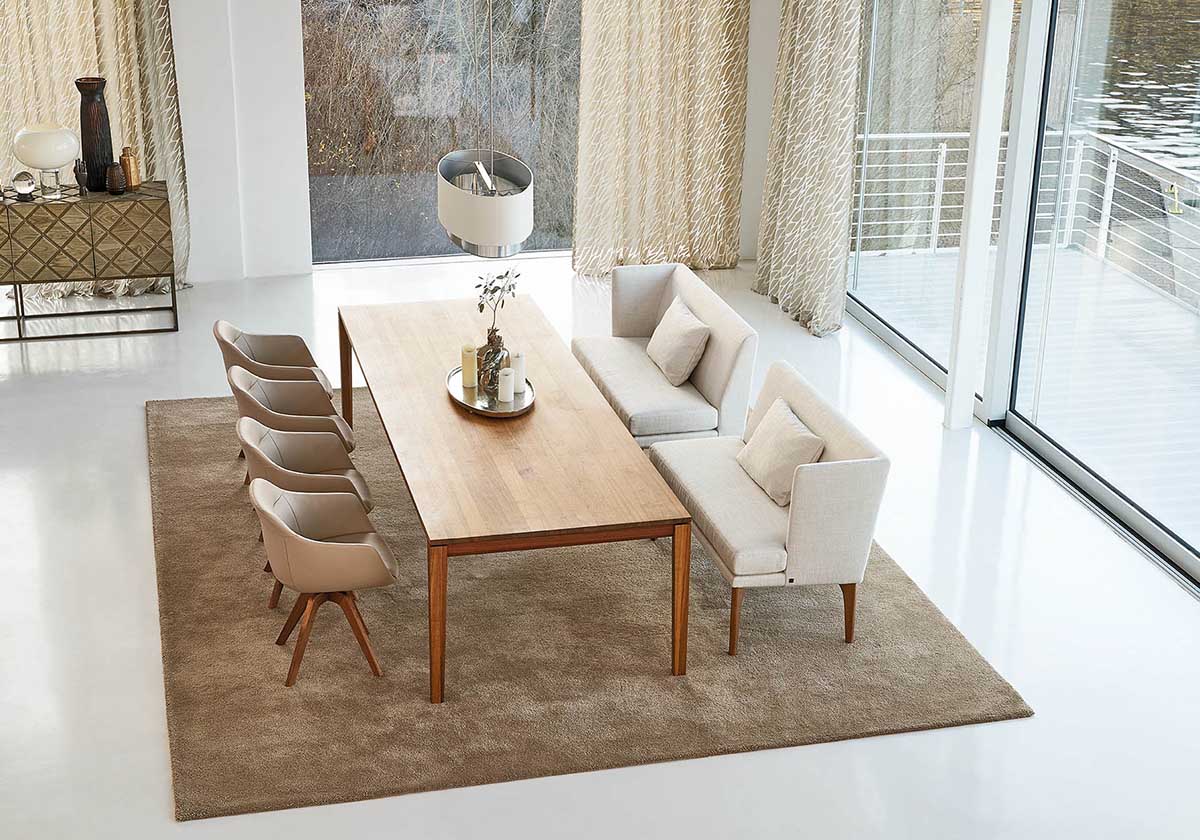 Sitzkomfort der besonderen Art bietet der Esszimmerstuhl Cara mit seinem filigranen, aber markanten Design. ESSZIMMERKULTUR DER BESONDEREN ART Cara eröffnet eine völlig neue Dimension guten Sitzens. Ob mit oder ohne Armlehnen – der markante Dining-Stuhl verbindet die besten Tugenden einer designorientierten Manufaktur: exzellente Funktionalität, überragenden Komfort, kompromisslose Qualität und richtungsweisendes Design. Die filigrane Formgebung, die von dem optional erhältlichen Draht-Untergestell noch unterstrichen wird, machen Cara zu einem wirklich außergewöhnlichen Sitzobjekt HOLZVARIANTEN GEBEIZT ODER LACKIERT Als echte Qualitätsprodukte werden die formschönen Esstische von BW aus massivem Holz gefertigt. Zur Wahl stehen drei heimische Arten mit besonders schöner Maserung. Für noch mehr Gestaltungsvielfalt gibt es verschiedene Oberflächen – von Natur geölt bis zu glänzend lackiert.