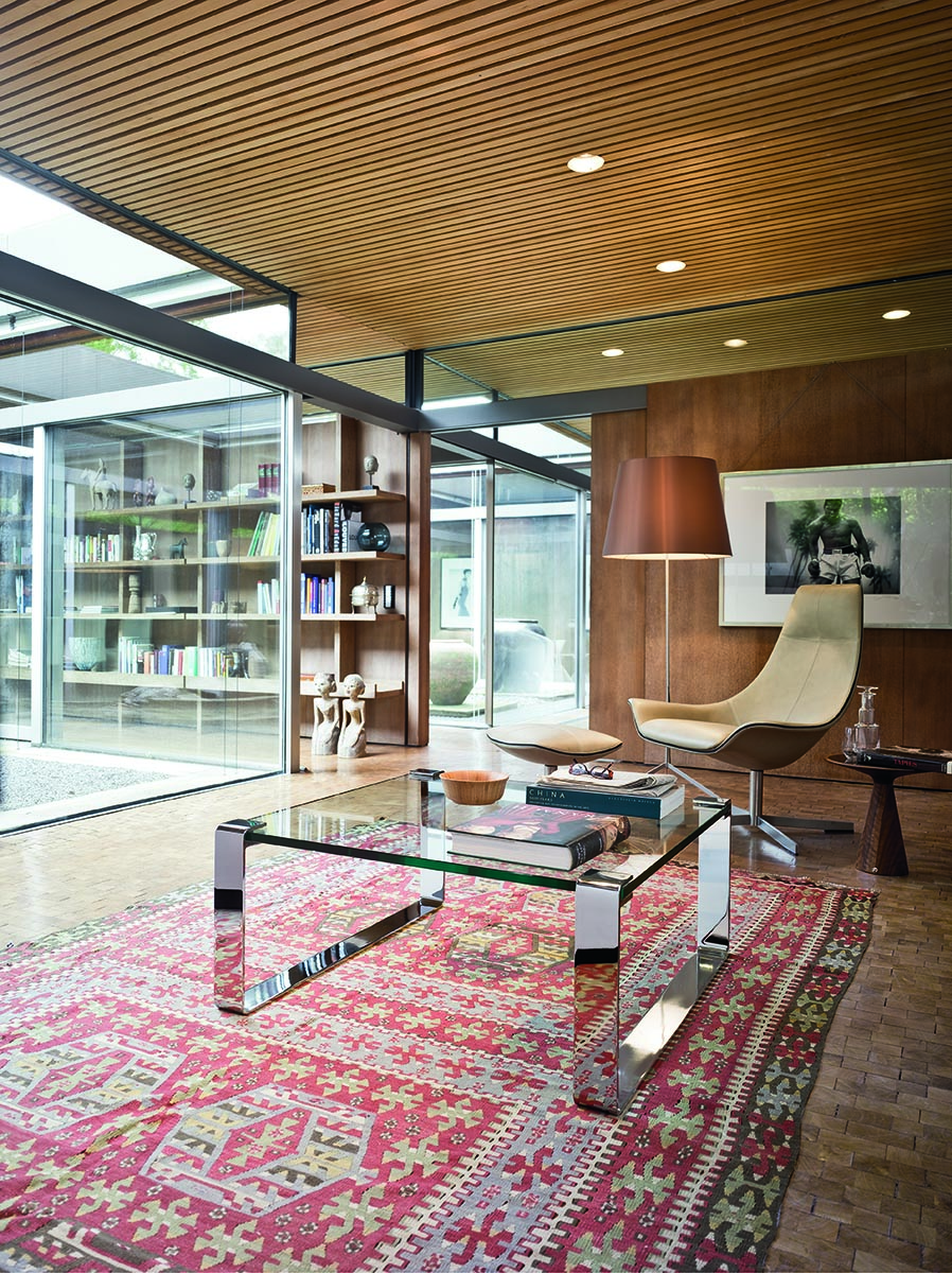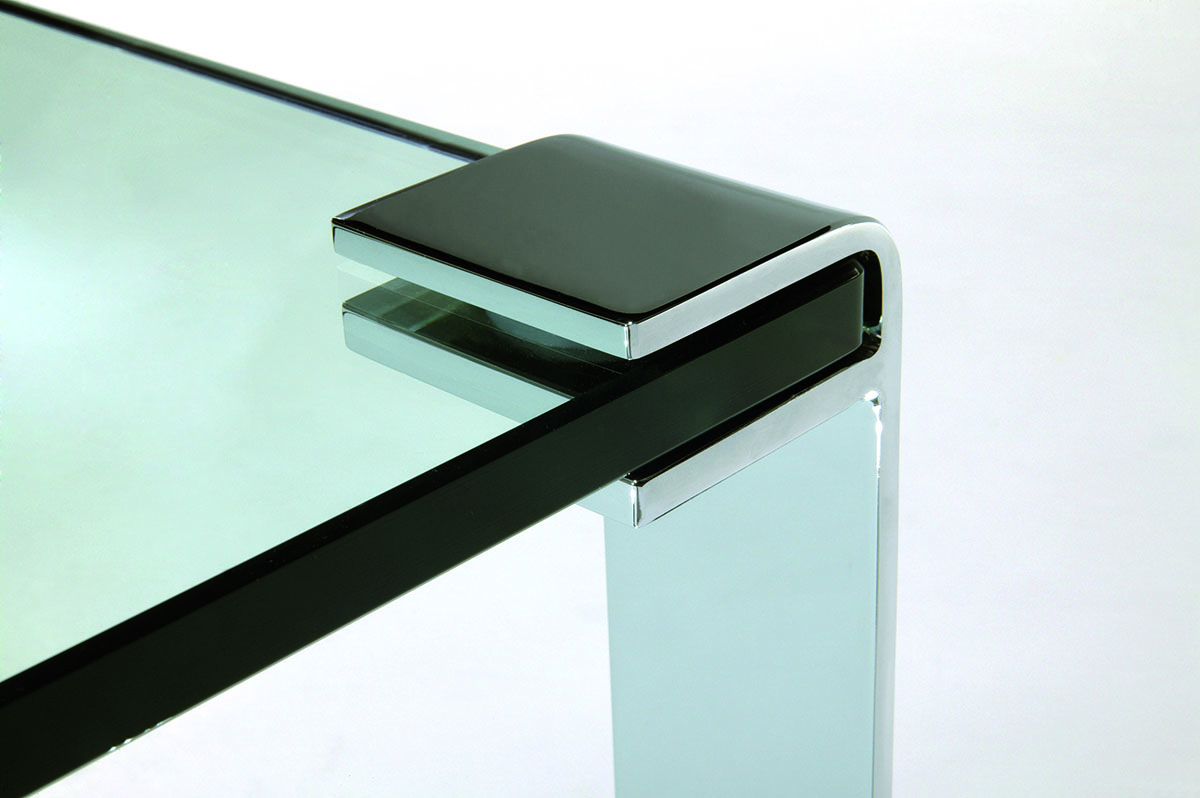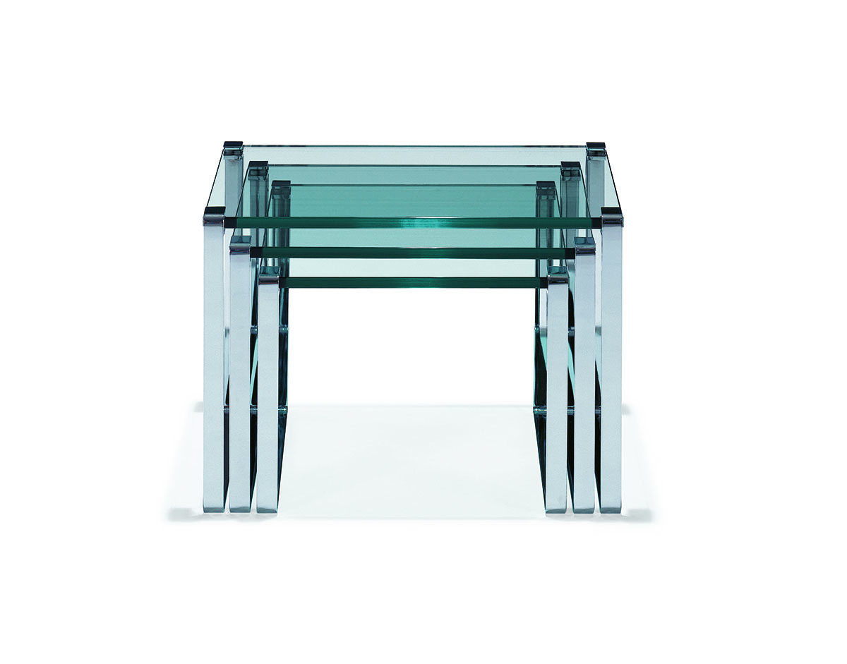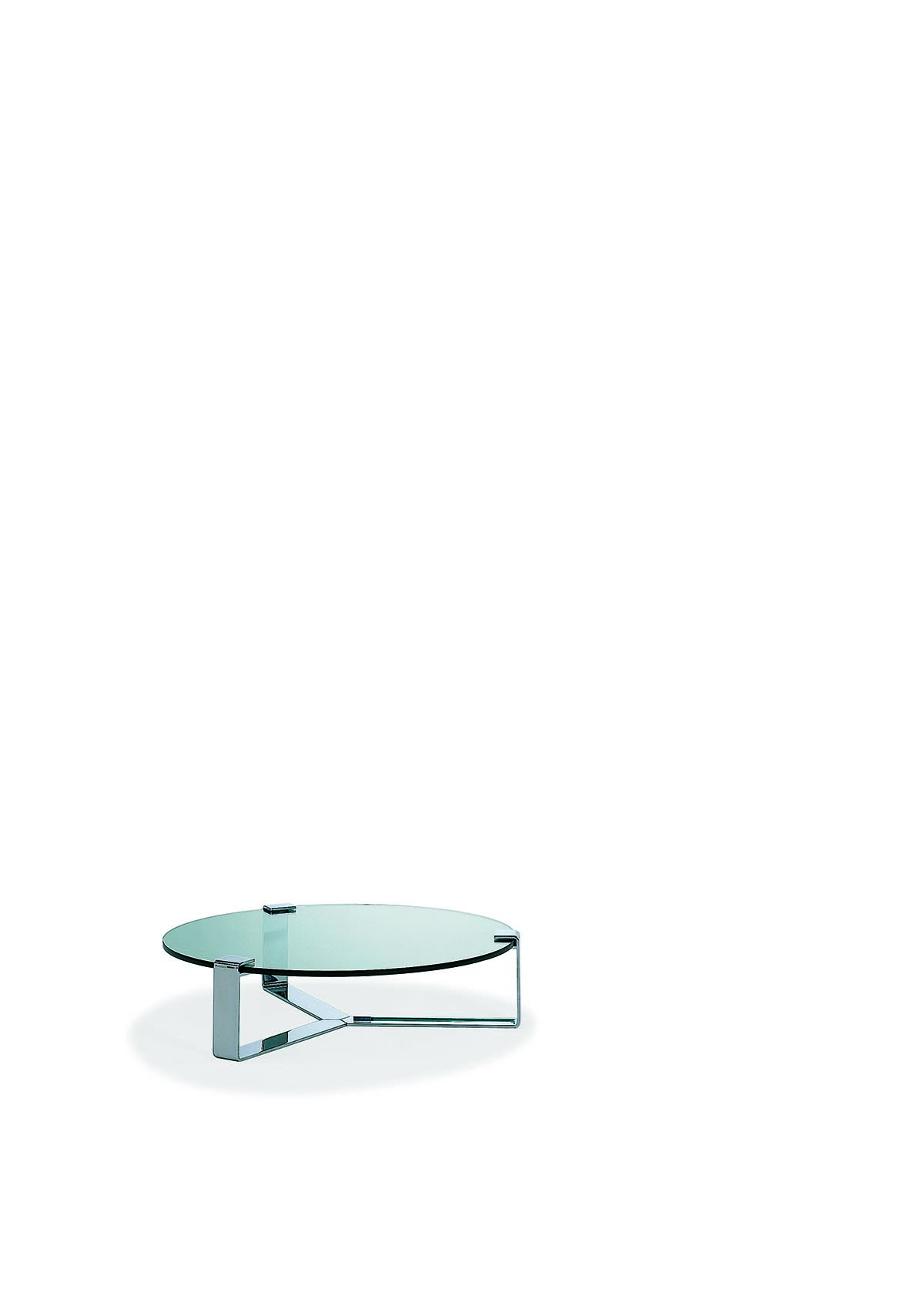 Der wohl erste zargenlose Tisch der modernen Formengeschichte. Das Modell wird als Dreisatz, als Beistelltisch, als Clubtisch und als Esstisch sowie Schreibtisch gefertigt. Es besteht aus einer 19 mm starken Glasplatte und Klemmkufen aus Stahl.