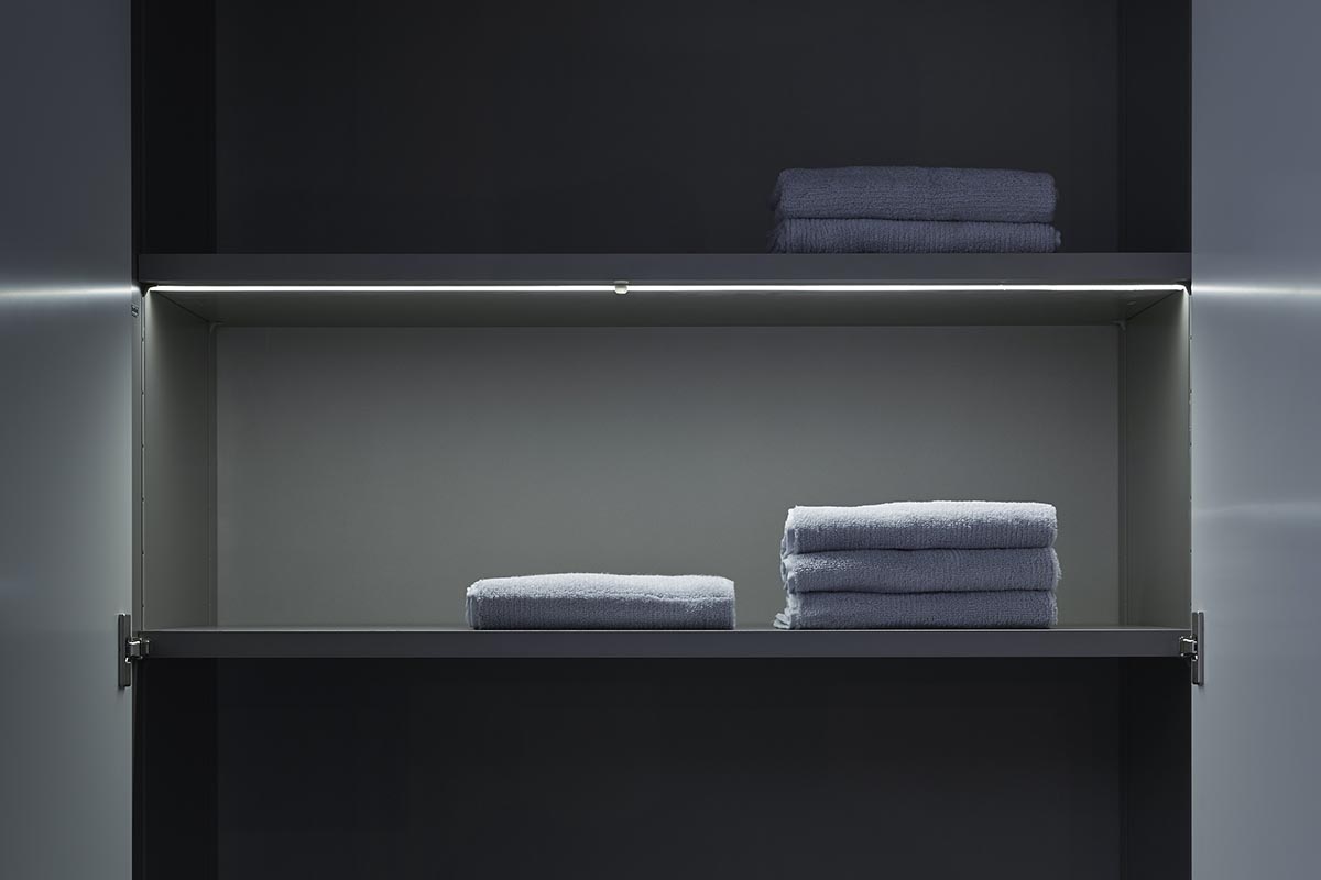 Einlegeböden mit integrierter Beleuchtung, die sich dank Bewegungsmelder beim Öffnen der Türen automatisch einschaltet und den Schrankinhalt in das rechte Licht rückt. Jederzeit bequem in der Höhe verstellbar und nachrüstbar, ohne auf irgendeine Verkabelung Rücksicht nehmen zu müssen