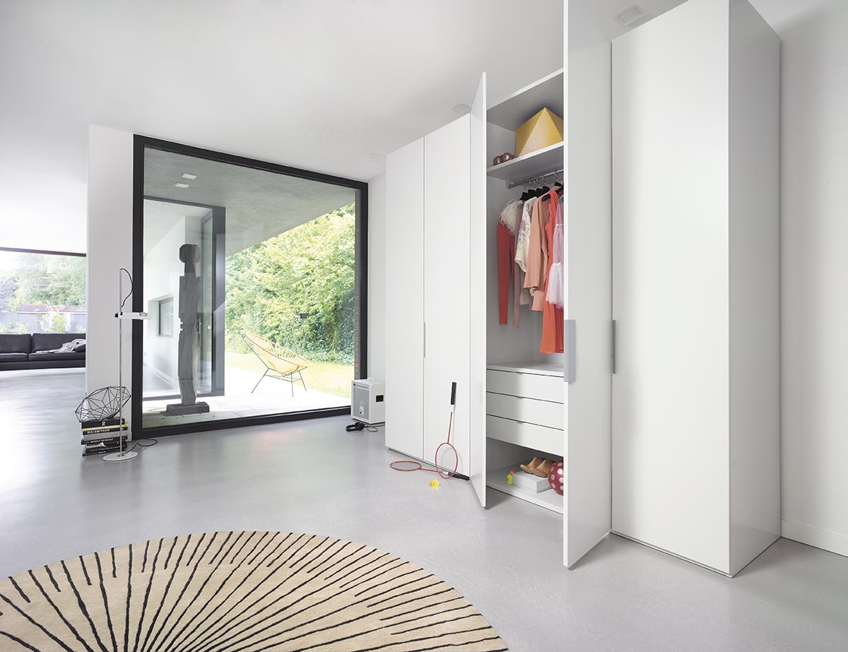 Einlegeböden mit und ohne Kleiderstange, Kleiderstangen, Innenschubkästen, Wäschekörbe, Hosenauszüge, Schuhauszüge, Schuhablagen, Einlegeböden mit Beleuchtung und Zwischenseiten lassen auch bei base hinsichtlich der individuellen Ausstattung fast keine Wünsche offen. Alle Ausstattungselemente sind in der interlübke typischen Lochschiene befestigt und lassen sich daher jederzeit in der Höhe verstellen und nachrüsten, ohne verbleibende Beschädigungen der Schrankseiten.