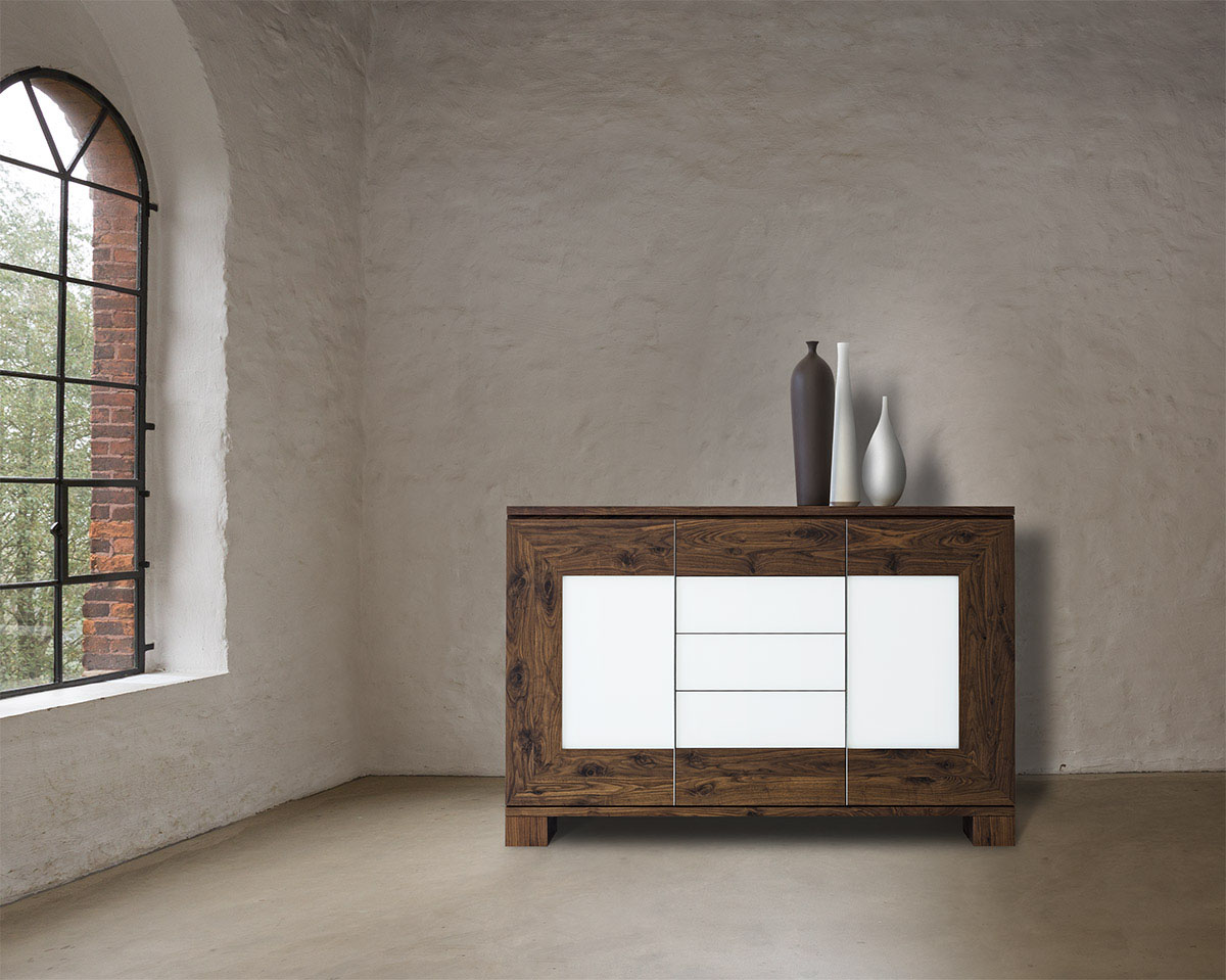 Die Anrichten VARUS sind ebenso wie TV- und Geschirrschränke auf Grund der großzügigen Maße wahre Raumwunder und wirken dennoch leicht. Dies liegt sicher an den ausgewogenen Proportionen, an der bewussten Symmetrie und der Bildhaftigkeit der Collection. Farbige Glasflächen, von edlem Massivholz gerahmt, bilden bestechende Kontraste