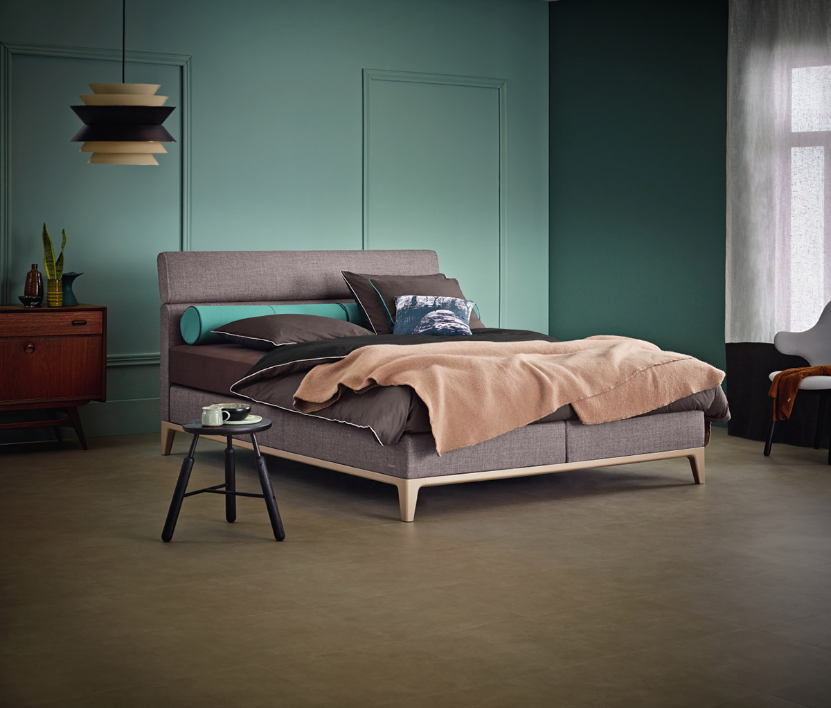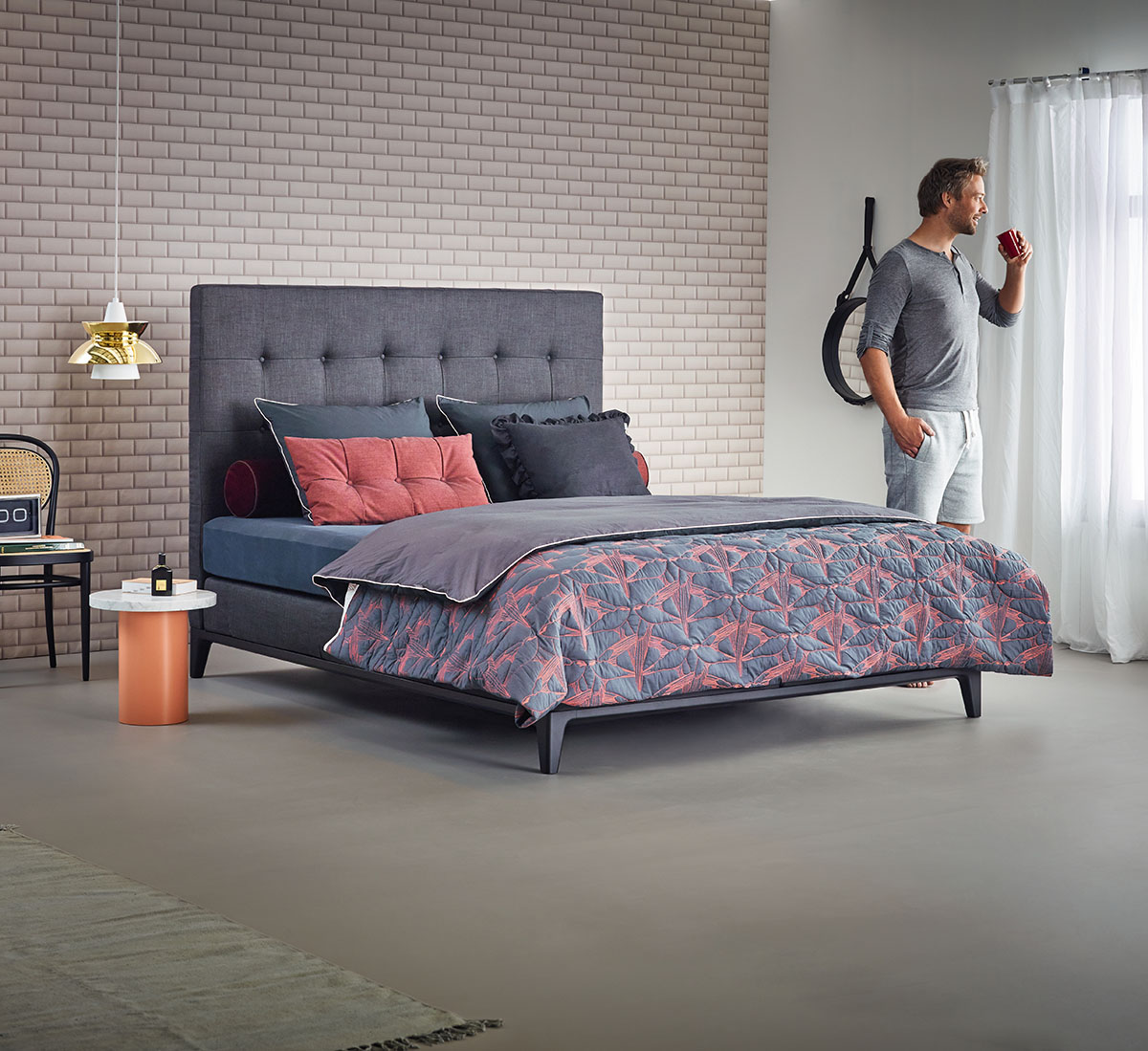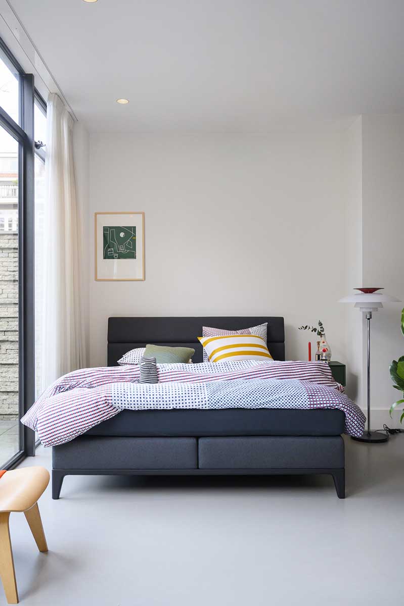 Boxspringbett Criade Raffiniertes Boxspringbett mit Stahlrahmen als Basis Das Criade ist ein raffiniertes Boxspringbett mit einer schlanken Linienführung. Der Stahlrahmen verleiht dem Criade seine einzigartige Handschrift, wobei die horizontale Linie das Design unterstreicht. Schaffen Sie eine einzigartige Atmosphäre in Ihrem Schlafzimmer, indem Sie Stoff und Rahmenfarbe individuell nach Ihren Wünschen kombinieren. Das Design des Criade Mit der schlanken Linienführung und den raffinierten Details ist das Criade ein eher zierliches Boxspringbett mit unverwechselbarem Design. Der Stahlrahmen unterstreicht das gradlinige Design und die horizontale Linie verbindet die beiden Boxen auch optisch. Die schlanken Beine verleihen dem Design der Criade ein luftiges Aussehen, während der Stahlrahmen eine solide Basis bietet. Außerdem ist das Criade niedriger als ein traditionelles Boxspringbett und liegt damit voll im Trend. Box, Matratzen und Topper liegen direkt auf dem Rahmen, sodass der Boden frei bleibt. Die Verwendung der verschiedenen Materialien macht das Design charakteristisch für Auping. Wählen Sie Ihre Lieblingsfarbe für den Rahmen, Ihren Stoff, Ihr favorisiertes Kopf- und Fußteil, ein elektrisch verstellbares Bett und stellen Sie sich Ihr eigenes Criade zusammen, nach Ihren persönlichen Wünschen und Bedürfnissen. Die Farben für das Boxspringbett Criade In unserer eigenen Fabrik in Deventer wird der Rahmen in der von Ihnen gewünschten Farbe pulverbeschichtet. Die Pulverbeschichtung ist ein Lackierverfahren, das den Stahl vor Verschleiß schützt und farbenfroh macht. Wählen Sie zwischen 10 verschiedenen Rahmenfarben, die bei Ihrem Criade den Ton angeben: Pure white, Deep black, Cool grey, Warm grey, Clay, Coral red, Rusty red, Night blue, Forest green oder Blush Die drei am häufigsten gewählten Farben für den Criade Rahmen sind: Deep black, Warm grey und Pure white. Stoffauswahl für das Boxspringbett Criade Für das Boxspringbett Criade können Sie aus 89 verschiedenen Stoffen wählen. Jeder dieser Stoffe hat eine andere Farbe und Struktur. In unseren Geschäften können Sie alle Stoffe sehen und die verschiedenen Texturen erfassen, um so den Stil zu finden, der perfekt zu Ihrer Einrichtung passt. Es gibt drei Stoffgruppen: Criade Kopfteile und Fußteile Für das Boxspringbett Criade können Sie aus vier Kopfteilen und drei Fußteilen wählen. Alle Kopf- und Fußteile von Auping werden in unserer Näherei in Deventer (Niederlande) von Hand gepolstert. Die Kopfteile sind rundum mit Stoff bezogen (Vorder- und Rückseite), so dass Sie Ihr Boxspringbett nicht nur an die Wand, sondern auch frei im Raum platzieren können. Die 4 Kopfteile: Plain: Ein rechteckiges Kopfteil mit einem eleganten, klaren Design (ist auch als Fußteil Plain erhältlich). Bend: ein Kopfteil mit abgerundeten Details und sanftem Knick im oberen Teil (ist auch als Fußteil Bend erhältlich). Square: ein hohes Kopfteil, gesteppt und klassisch mit runden Knöpfen versehen (ist auch als Fußteil Square erhältlich). Cushion: ein weiches und komfortables Kopfteil mit abgesteppten Metallstäben, die die gleiche Farbe wie der Rahmen der Box haben Der Aufbau eines Boxspringbettes Das Boxspringbett Criade ist wie folgt aufgebaut: Die Box besteht aus einer Spiralunterfederung und Taschenfedern. Die Auping Spiralunterfederung verfügt über eine zu 80 Prozent offene Struktur und belüftet das Bett daher sehr gut. Die Taschenfedern, welche sich sowohl in der Box als auch in der mit Stoff bezogenen Matratze befinden, sorgen dafür, dass Sie sich nachts leicht drehen können und im Schlaf gut gestützt sind. Das Boxspringbett Criade ist in verschiedenen Abmessungen verfügbar: Mögliche Breiten: 80, 90, 100, 120, 140, 160, 180 oder 200 cm. Mögliche Längen: 200, 210 oder 220 cm. Matratzen für Ihr Boxspringbett Auf dem Rahmen des Boxspringbettes Criade liegen zwei Boxen, darüber die Matratzen. Sie können aus zwei Varianten an Matratzen wählen, die stoffbezogene Boxspringmatratze oder eine klassische weiße Matratze. Wenn Sie sich für die stoffbezogene Alternative entscheiden, sorgt ein Topper für zusätzlichen Schutz der Matratze. In unseren Geschäften erhalten Sie eine umfangreiche Beratung, welche Matratze für Sie und Ihre Bedürfnisse und Wünsche am besten geeignet ist und Ihren Körper am besten unterstützt. Sowohl die stoffbezogenen Auping Matratzen als auch die weißen Matratzen bestehen aus Taschenfedern und bieten optimalen Halt und Unterstützung. Die verschiedenen Lagen des Boxspringbettes sorgen für ein bestimmtes Liegegefühl, das für jeden anders und sehr persönlich ist und unabhängig von der Unterstützung ist, die Ihr Körper benötigt. Daher ist es wichtig, dass Sie sich Zeit zum Probeliegen nehmen. Der beste Boden für Ihr Boxspringbett Die Basis aller Auping Boxspringbetten ist die Spiralunterfederung, auch Spiralboden genannt. Dieser Spiralboden sorgt durch seine offene Struktur bei allen Boxspringbetten und Betten für eine optimale Durchlüftung. Die Spiralunterfederung wurde 1888 von Johannes Auping erfunden und im Laufe der Jahre weiterentwickelt und optimiert. Sie besteht aber immer noch aus fest geflochtenem Stahldraht und ist zu 80 % offen und luftdurchlässig. Die Spiralunterfederung in Kombination mit den Auping Matratzen sorgt für eine gute Durchlüftung, die nicht nur den Schlaf verbessert, sondern auch die Lebensdauer eines Auping Boxspringbettes verlängert, sodass Ihr Bett immer frisch ist. Für zusätzlichen Komfort im Rückenbereich Das Boxspringbett Criade können Sie nicht nur in der sogenannten flachen Variante, sondern auch mit unterschiedlich verstellbaren Boxen erhalten. Wenn Sie im Bett gerne lesen oder fernsehen, bietet Ihnen ein verstellbarer Rückenteil zusätzlichen Komfort. Bei Erkältungen oder Verletzungen kann die Verstellbarkeit von Rücken-, Bein- oder Nackenbereich sogar Ihren Schlaf erleichtern. Es gibt 3 Varianten für die verstellbaren Boxspri